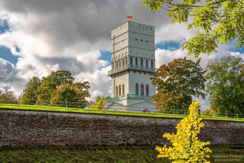 Павильон Белая башня — великолепный образец неоготики первой трети XIX века, похожий на средневековый рыцарский замок, был построен в 1821-1927 годах по проекту архитектора А.А. Менеласа для сыновей императора Николая I — великих князей Александра, Николая, Михаила и Константина. Высота башни 37,8 метра, она окружена неглубоким рвом.