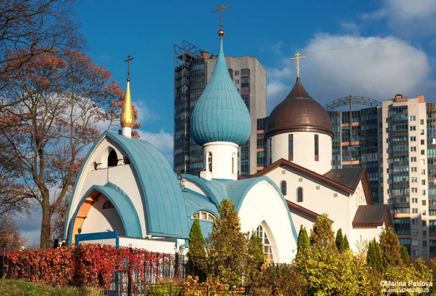 Осенний храм святого праведного Иоанна Кронштадтского( голубые купола) и строящееся здание храмового комплекса:верхний храм – в честь Всемилостивого Спаса, храм на первом этаже - крестильня в честь святых Царственных Страстотерпцев.