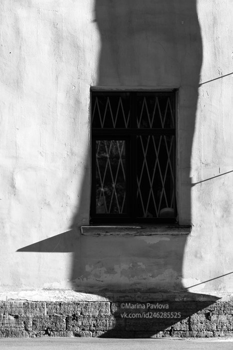 Тень водосточной трубы и подоконника под углом солнечного света трансформировалась, "нарисовав" на стене дома образ уже взрослого, но до сих пор наивного Буратино.