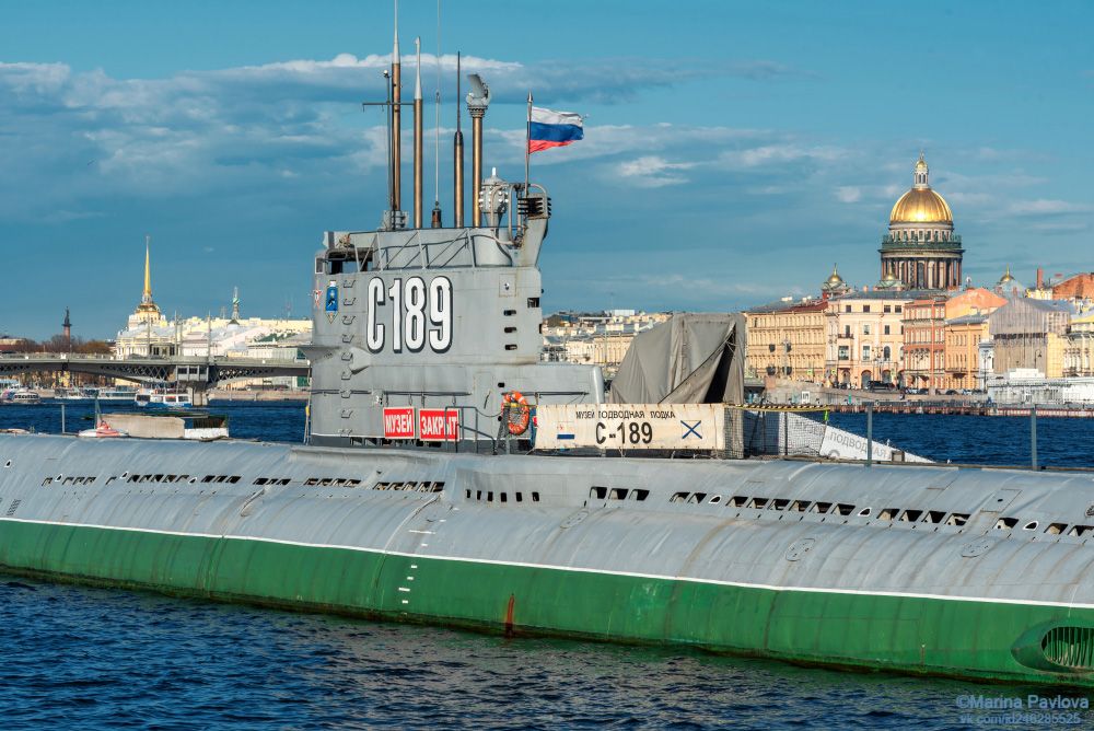 Вечер. Река Нева. Исаакиевский собор, Адмиралтейство, купола храма "Спас на Крови", Александровская колонна, фрагмент подводной лодки С-189, фото и историю музея подводной лодки можно посмотреть здесь https://35photo.pro/photo_6332426/