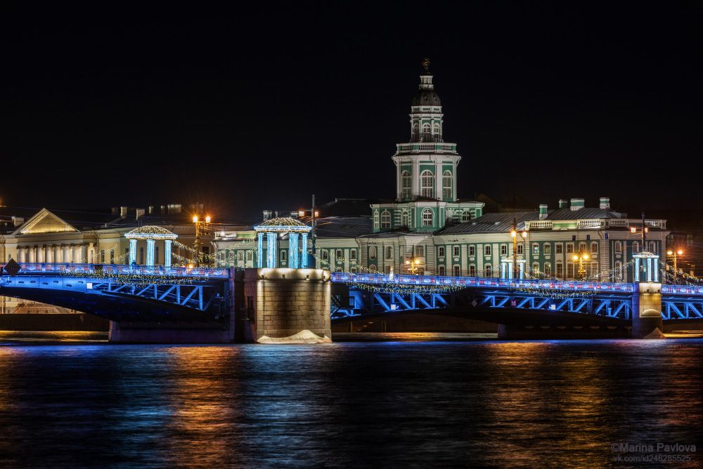 Дворцовый мост. Кунсткамера. Музей антропологии и этнографии им. Петра Великого (Кунсткамера) Российской академии наук (МАЭ РАН) – один из крупнейших и старейших этнографических музеев мира, коллекционные фонды которого насчитывают свыше 1.2 млн. единиц хранения. Он является преемником первого российского государственного публичного музея, знаменитой Петровской Кунсткамеры, основанной Петром I в 1714 г.