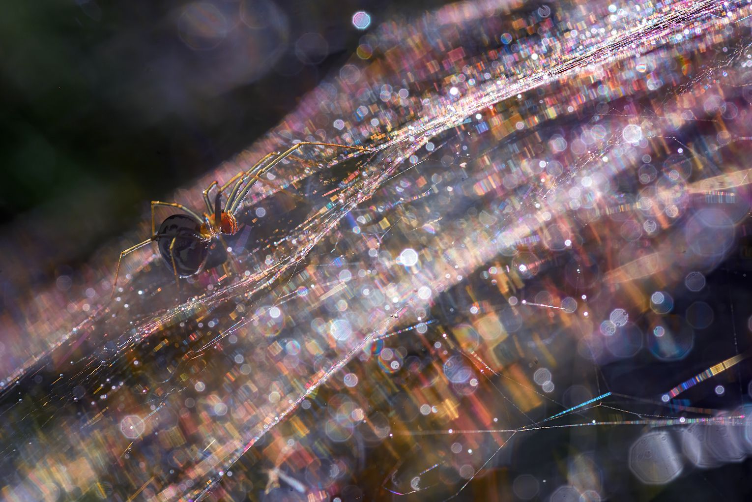 Фото сделано в лучах солнца. Паучок сидел на мокрой паутинке в капельках, которые переливались всеми цветами радуги ???. Еще я применила здесь функцию мультиэкспозиции в фотоаппарате, что на мой взгляд, увеличило \"космическую составляющую\" Паука из Макровселенной