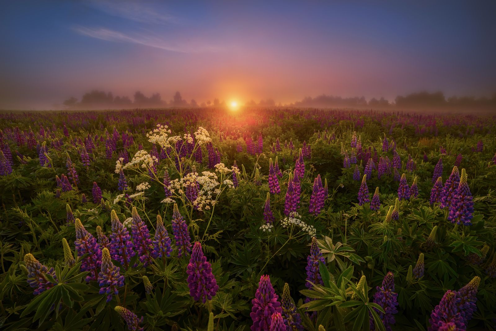 утро, рассвет, люпины, цветы, лето, солнце, Марина Мурашова