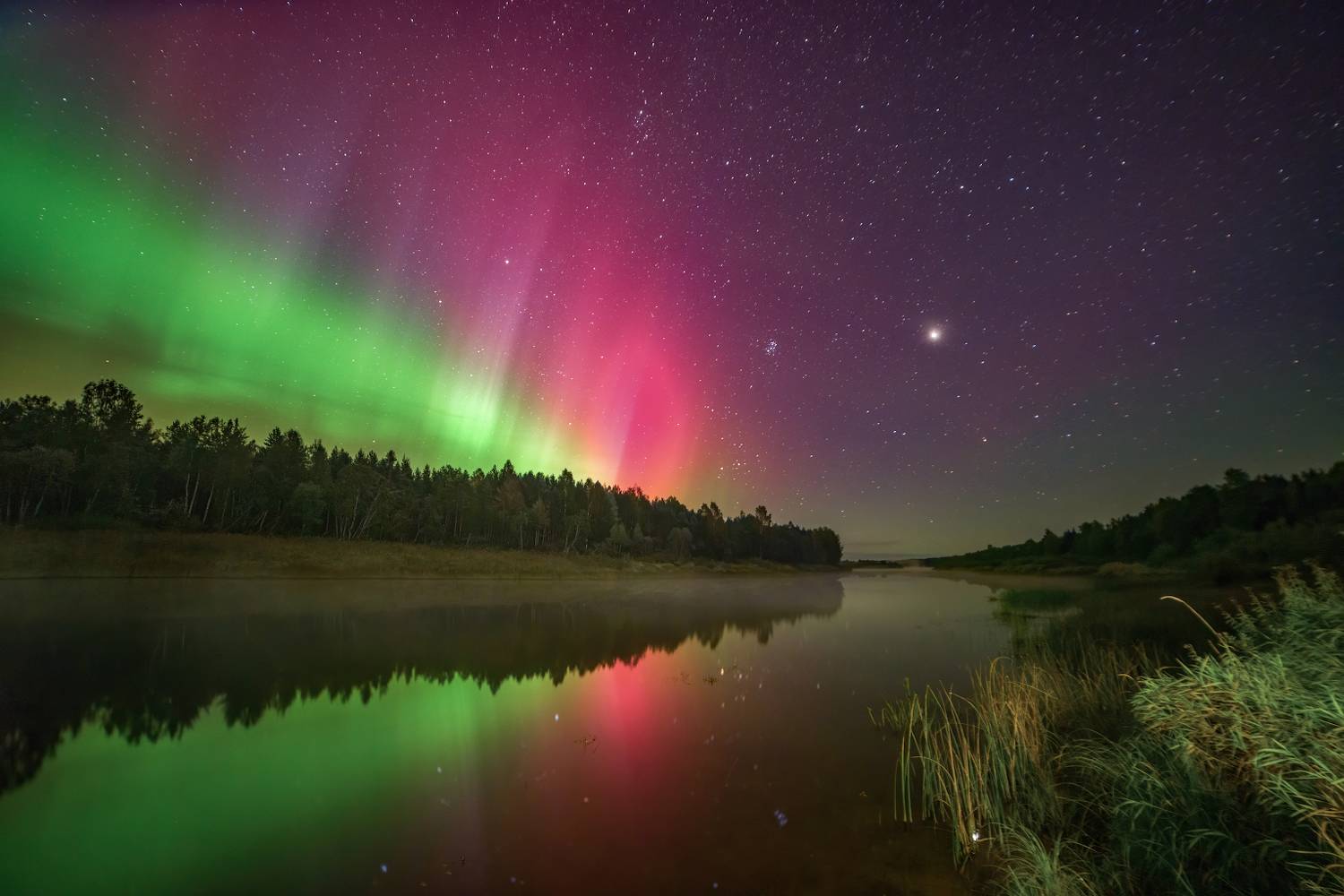 Большая удача поймать сияние в наших широтах - и вот, наконец это случилось - сияние показало себя во всей красе! Северное сияние над рекой Молога, Ижина 12, 18.09.23. Вологодская область