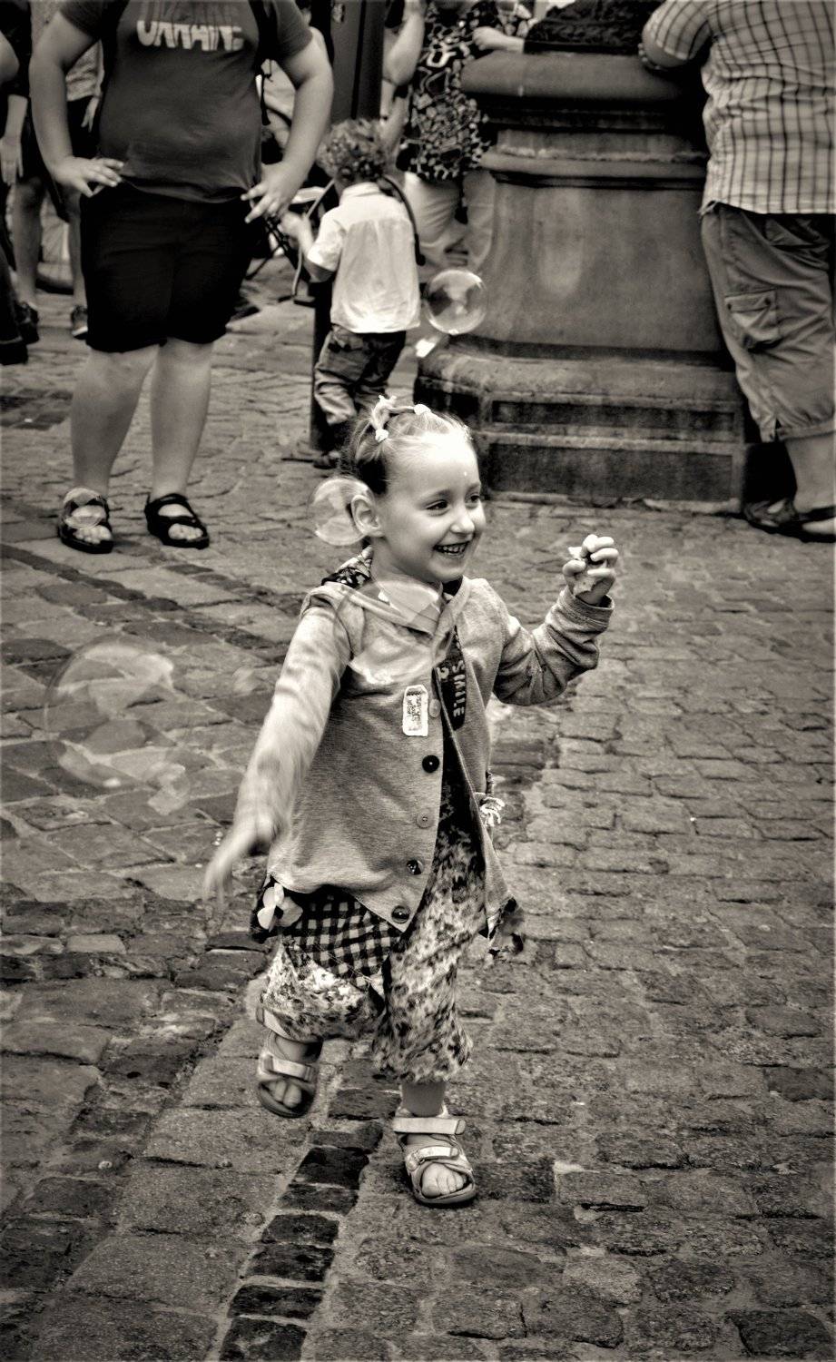 ...Невдалеке, на площади, начинался джазовый концерт, а у детей был свой праздник, они ловили огромные мыльные пузыри, бегали, прыгали и шумели... Мое внимание привлекла эта девочка, она держала в одной руке пирожок, все время откусывала по кусочку, и при этом ловко бегала, прыгала и ловила пузыри свободной рукой. Она была лучше всех, самая ловкая, и стремительная, все время улыбалась, ее обаянию не было предела... Я про себя назвала ее " королева мыльных пузырей":))...