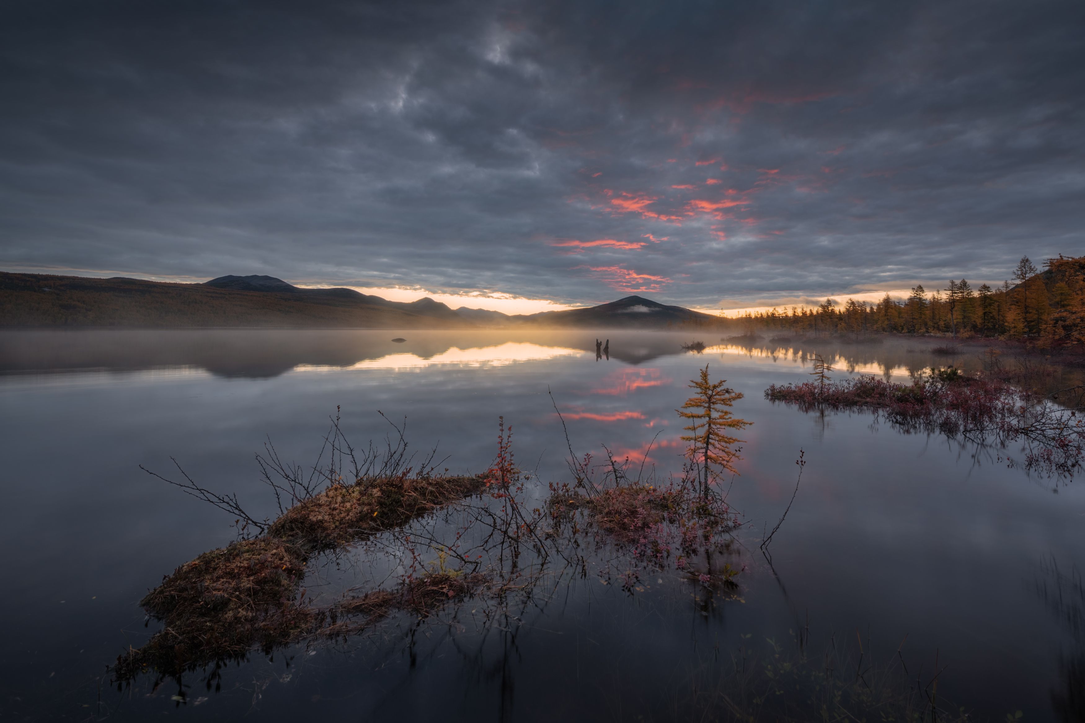 На рассвете озеро Джека Лондона окутано легким туманом, который скользит по поверхности воды, словно живое одеяло. Небо, окрашенное в оттенки серого и розового, отражается в зеркальной глади, создавая эффект двойной реальности. На переднем плане — высохшие кусты и молодые деревца, выступающие из воды, добавляя текстуру и глубину кадру. Вдали — силуэты холмов, теряющихся в дымке. Фотография передает тишину и величие природы, застывшей в мгновении пробуждения. Работа Михаила Широбокова.