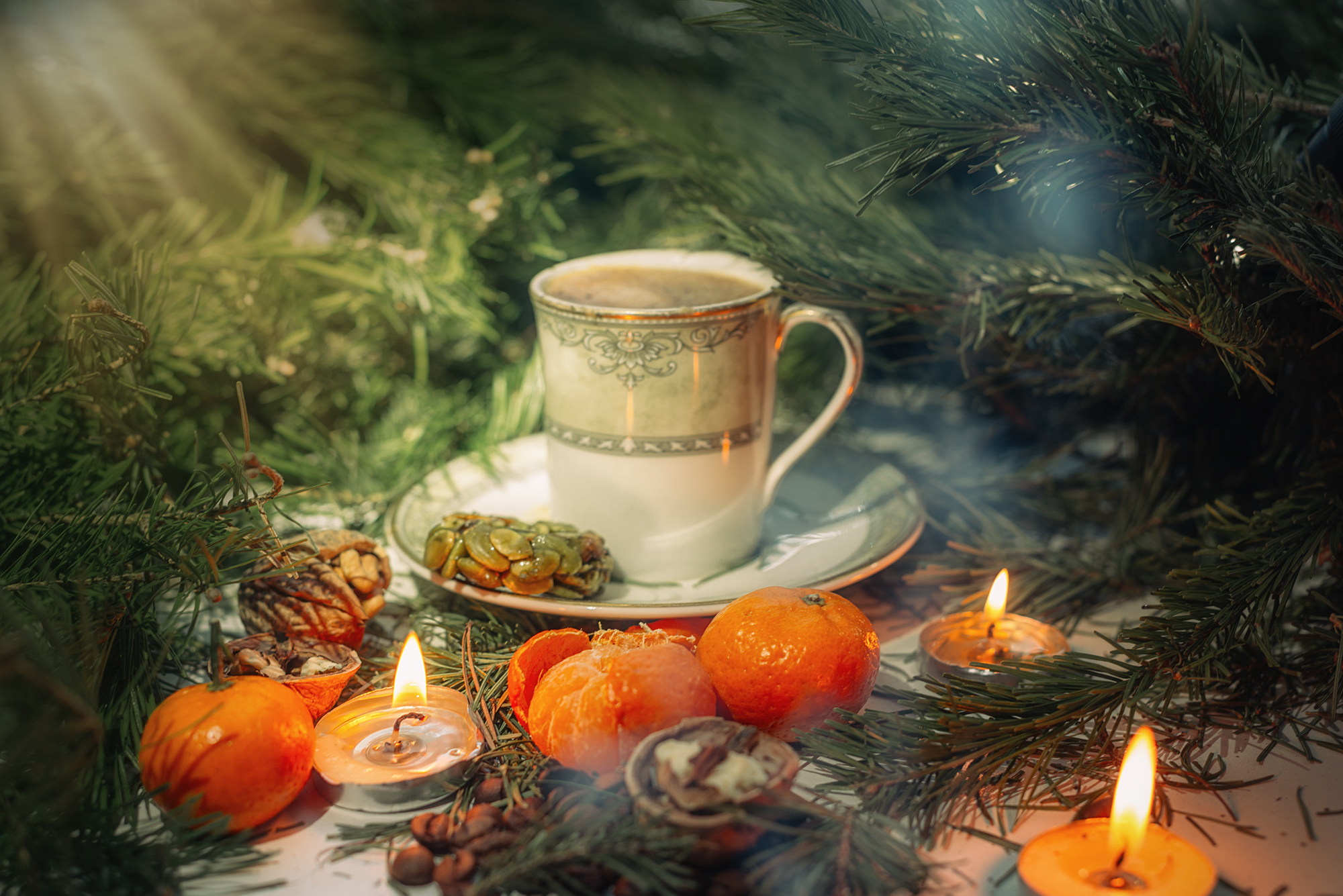 кофе чашка ёлка мандарины свечки орехи,  Мария
