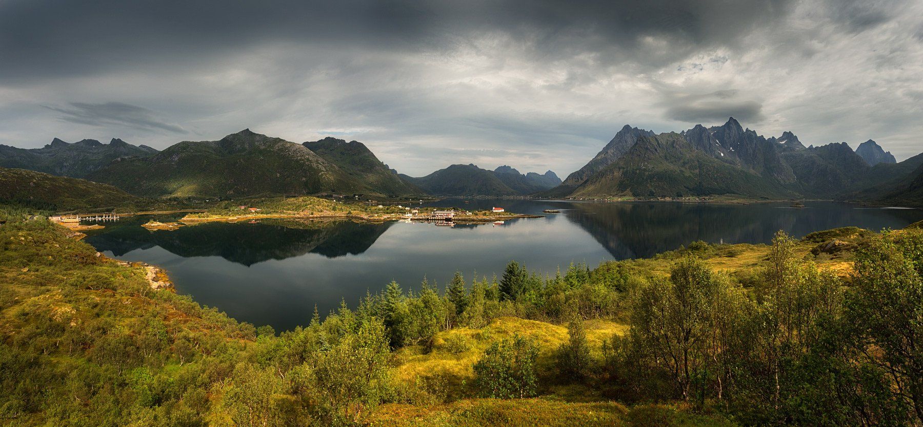 Панорама с острова Ауствогёя (Austvågøya, Лофотенские острова). Прямо по курсу на небольшом полуострове - кемпинг Sildpollnes, приютивший нас на пару пасмурных дней. Там же виднеется и небольшая церковь с красной крышей, имеющая такое же название.