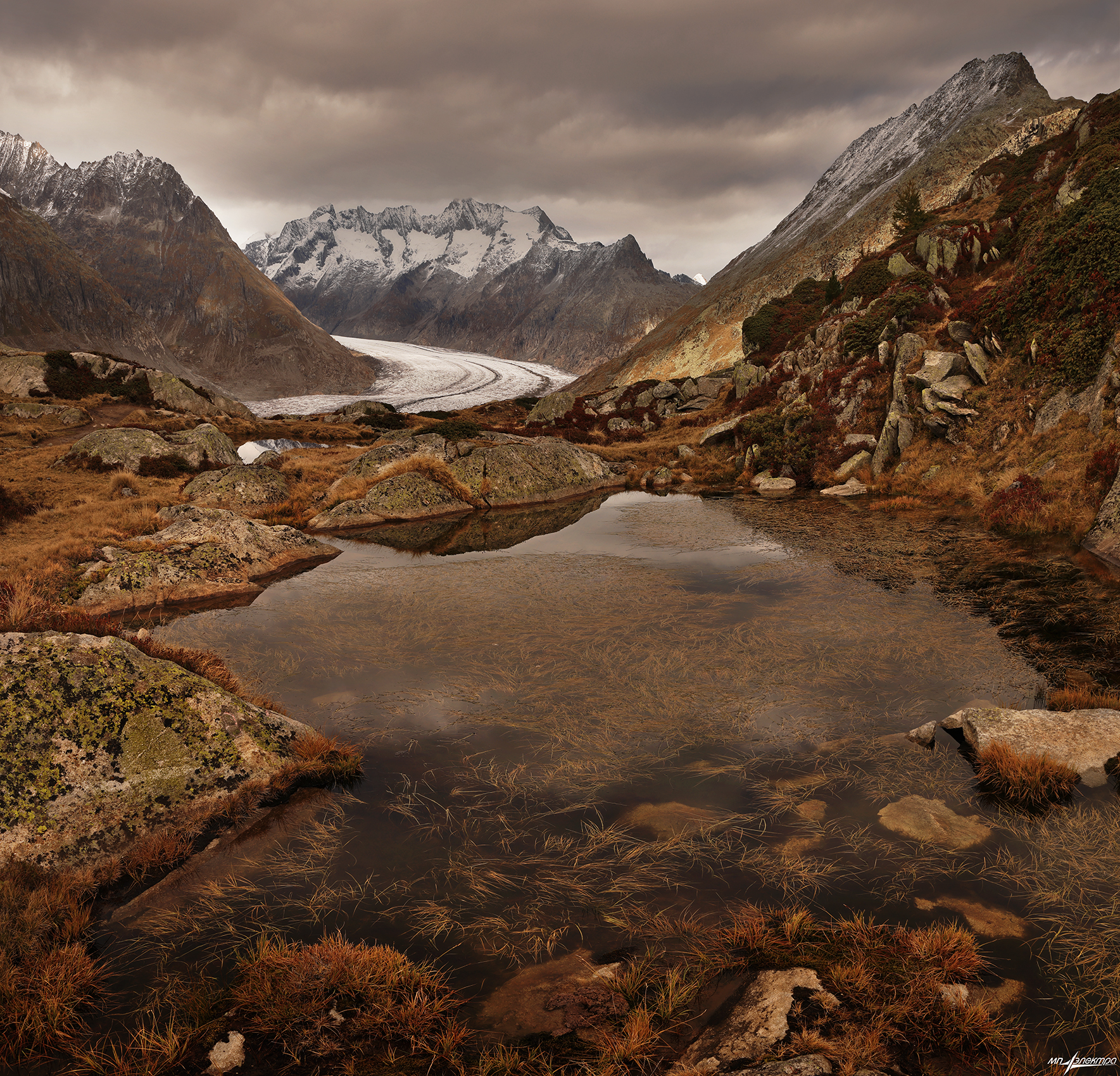 В сердце швейцарских Альп, где ледник медленно стекает в ущелье, вода в небольшом озере словно хранит дыхание гор. Мрачные облака, ржаво-коричневая растительность и гранитные склоны создают контраст, в котором природа выглядит одновременно суровой и вдохновляющей. Фотограф Матвеев Николай запечатлел момент, когда человек, стоя у края, чувствует себя частью этого величественного единства — не наблюдателем, а участником вечного цикла. Это не просто пейзаж — это внутреннее отражение.