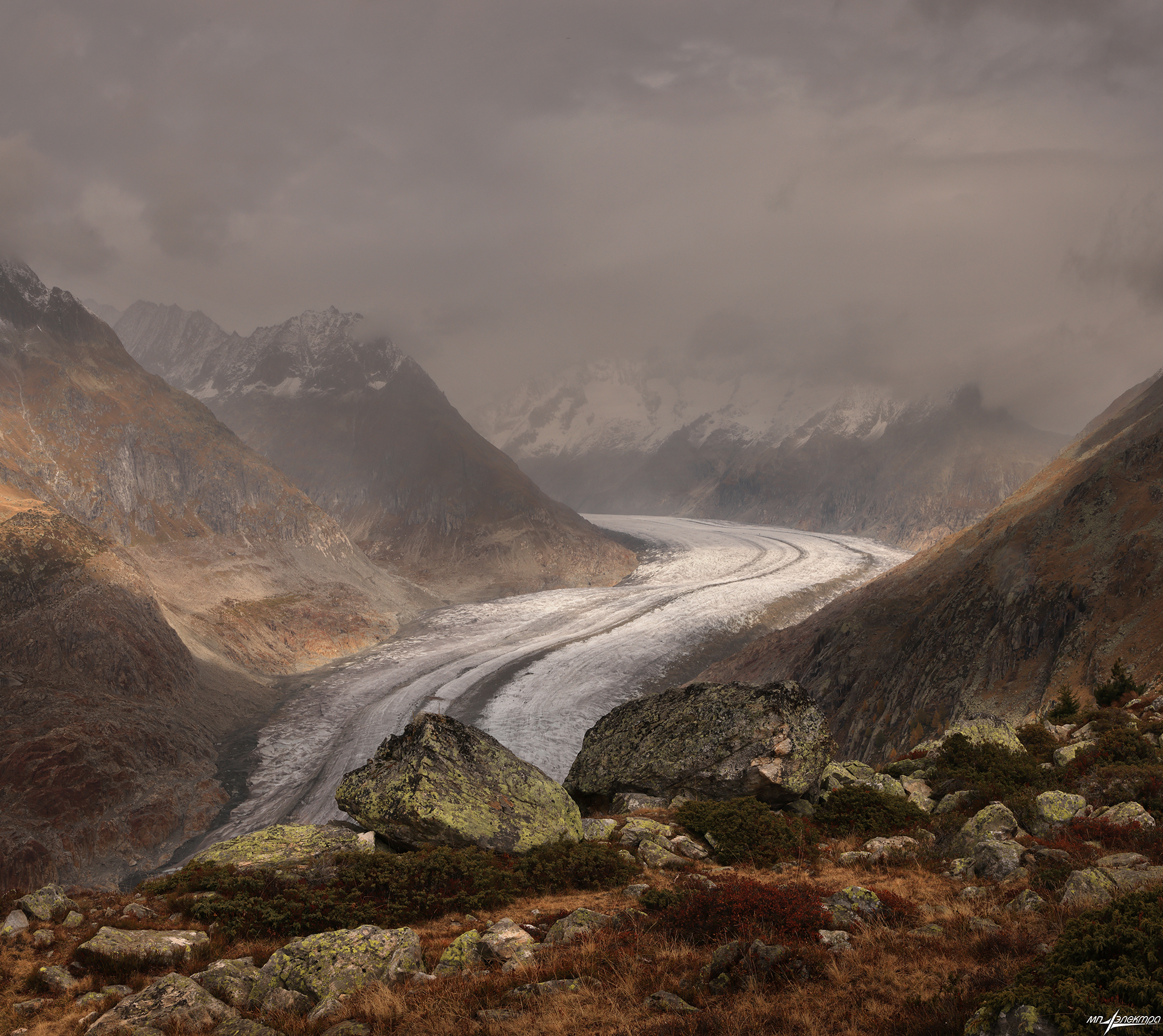 В тишине швейцарских гор ледник, словно древний река изо льда, пронзает долину, уходя в туман. Камни на переднем плане, покрытые мхом, словно хранят память о тысячелетиях. Небо — серое, как мысли, уставшие от суеты. Фотограф Матвеев Николай запечатлел момент, когда природа не просто существует — она дышит. Это не просто пейзаж. Это приглашение замедлиться, вдохнуть холодный воздух и услышать тишину. Релакс — не состояние, а место.