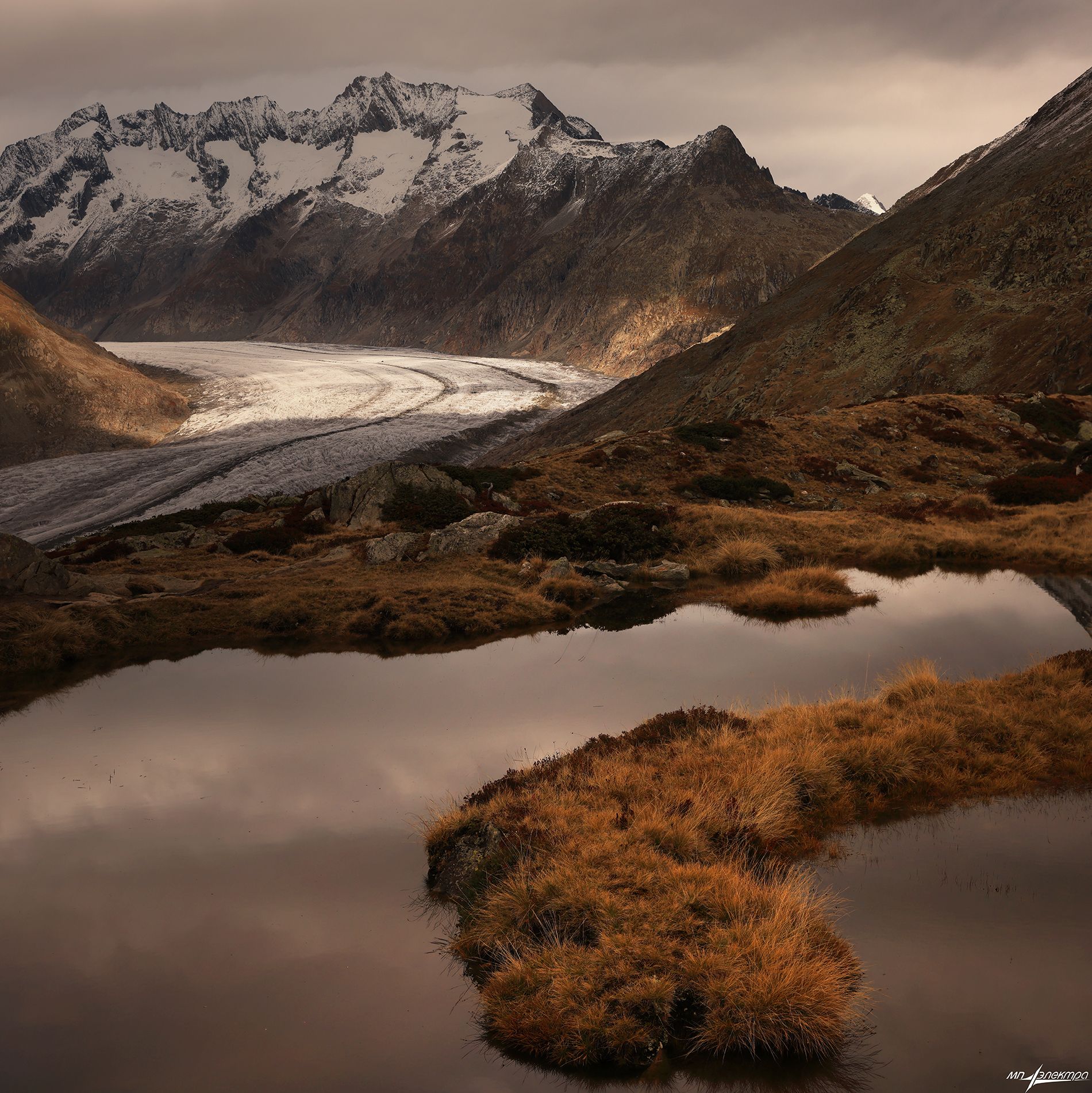 На снимке — пейзаж швейцарских Альп, где ледник, словно рисунок, извивается между скалами. Его отражение в спокойной воде озера создает симметрию, подчеркивающую величие гор. Осеннее освещение придаёт сцене тёплые, землистые тона. Фотография передаёт молчаливую мощь природы и её хрупкую красоту. Матвеев Николай.