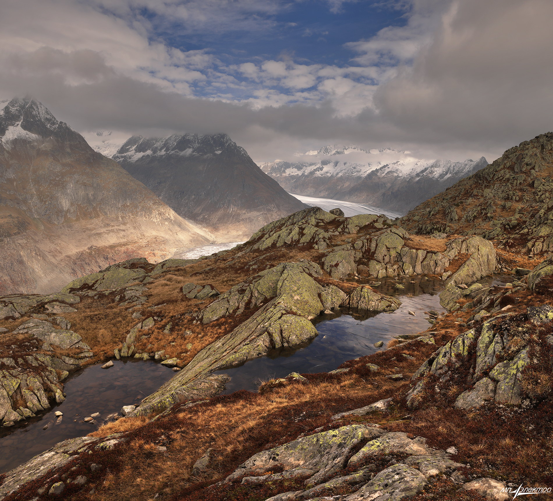 На снимке — драматический пейзаж высокогорья, где последний свет дня озаряет скальные выступы и отражается в небольшом озере. Вдали — снежные пики, уходящие в облачное небо. Композиция передаёт ощущение одиночества и величия природы. Фотография отражает тонкую игру света и тени в суровом ландшафте.