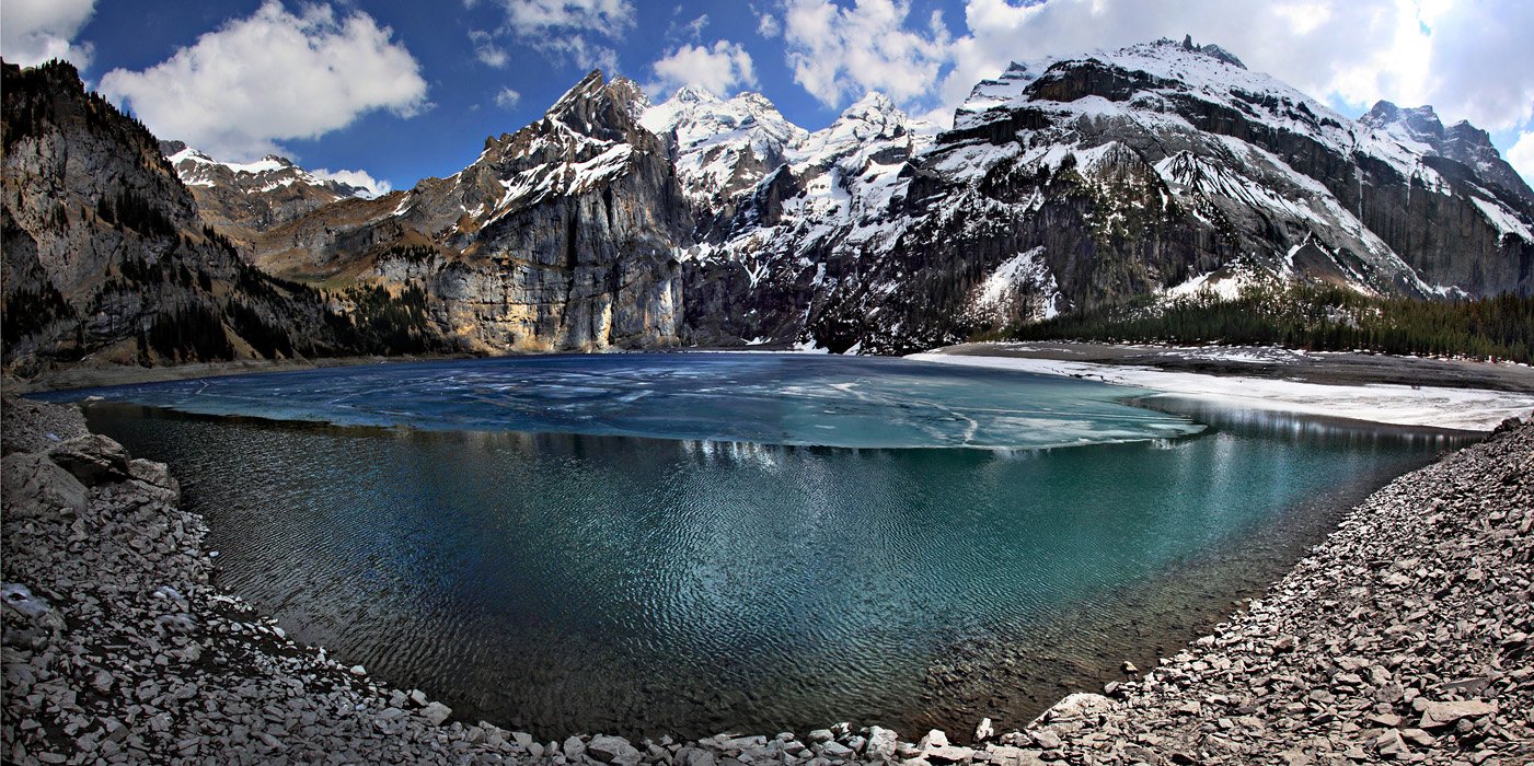 Несколько тысячелетий назад при падении скалы высоко в горах образовалось озеро. Его глубина более 60 метров при общей площади всего 1,5 кв.км…оно считается самым большим среди высокогорных альпийских озёр…это озеро Oeschinensee