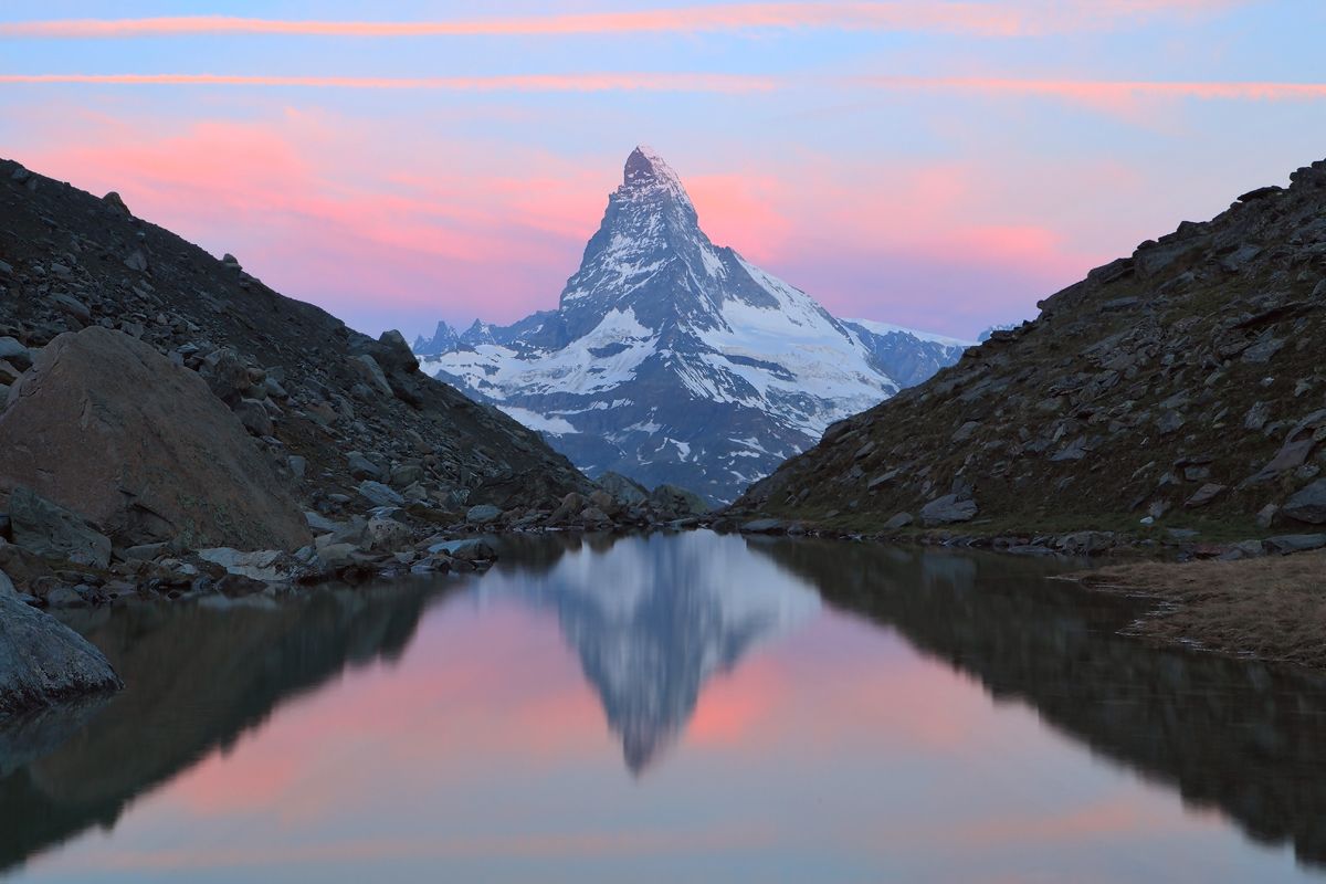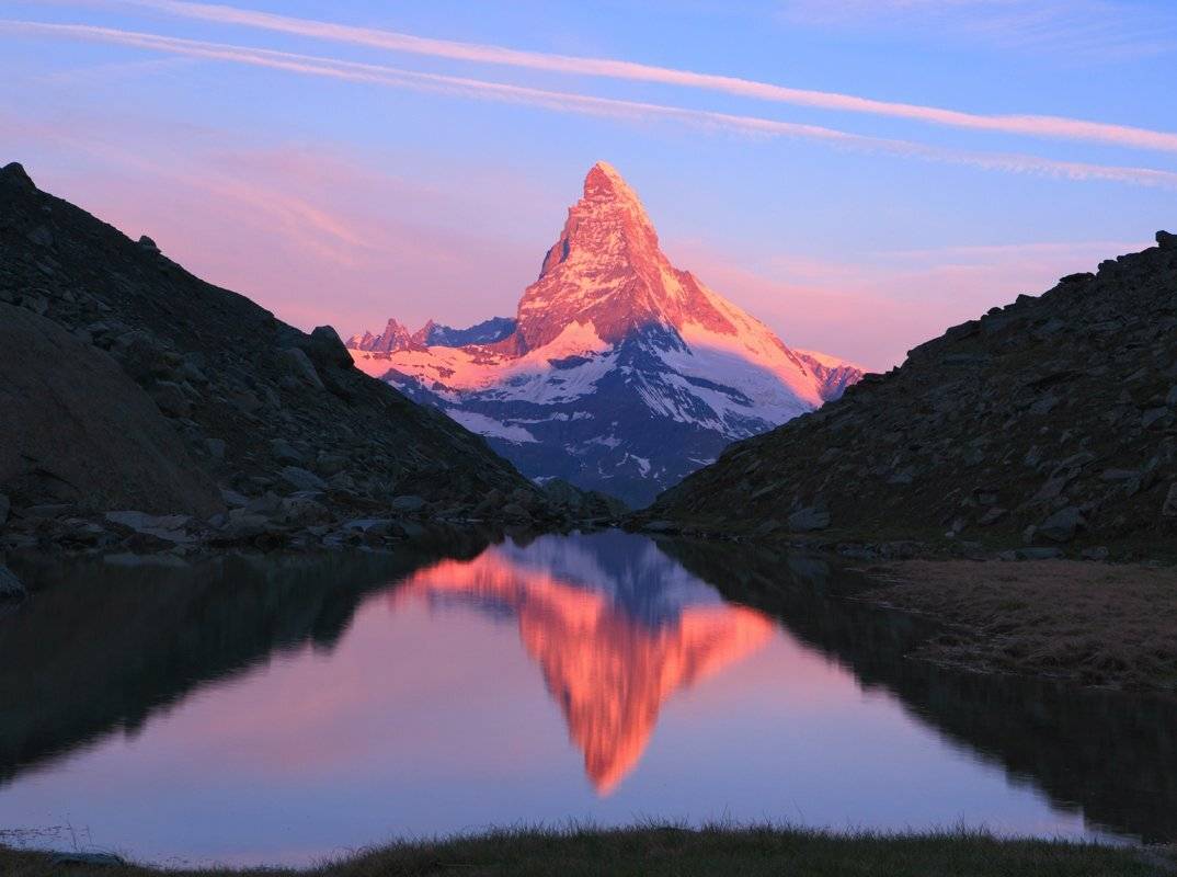 Давно брожу в этих местах, знаю тут десятки озёр в которых отражается Маттерхорн, но хотелось найти озеро, отражающее треугольную суть вершины …и вот недавно примерно на высоте 2800м нашёл как мне показалось подходящее маренное озерко, правда была непогода и самой горы было не видно…..ну а дальше всё как обычно, вернулся на это место перед восходом солнца и сфотографировал…..штатив тросик градиент на 3стопа
