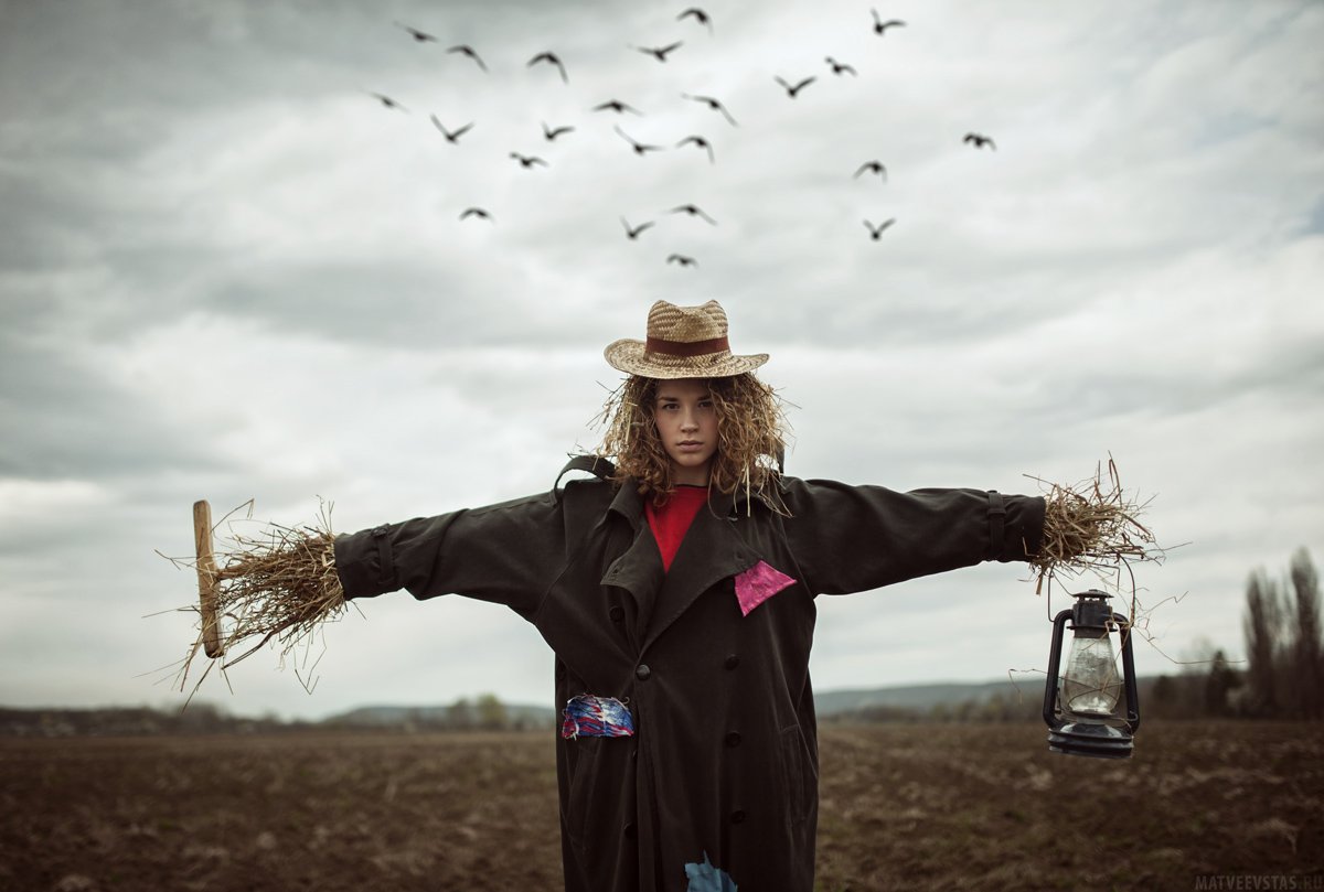 Небо, Плащ, Поле, Птицы, Пугало, Солома, Фонарь, Матвеев Стас