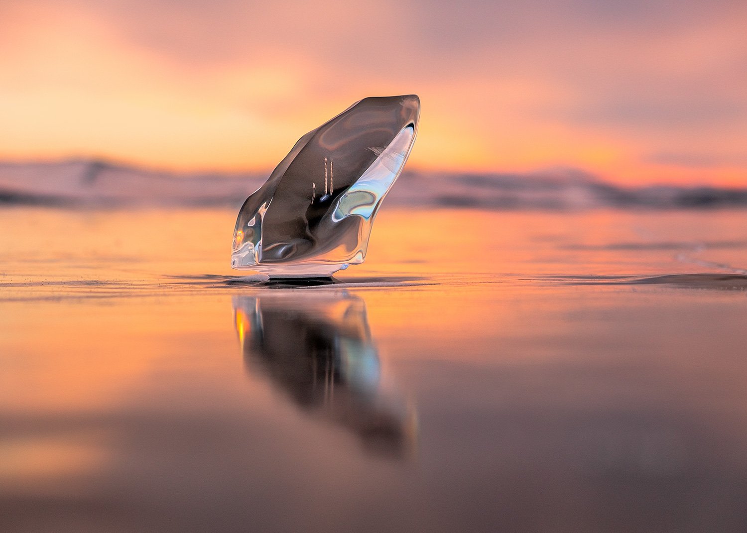 Гляньте на основание. Лишь тончайшая пластинка мерзлой воды удерживает этот кристалл на ледовом зеркале. Ну и конечно закат, он сделал свой финальный штих. Январь 2018. Фототуры по Байкалу.