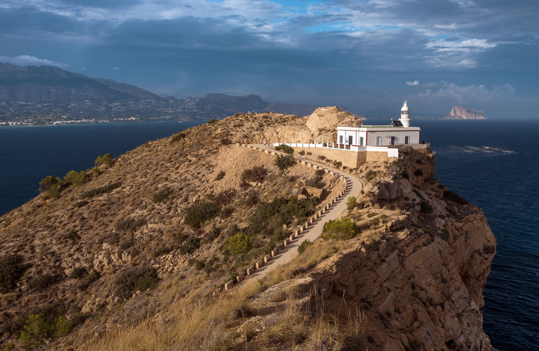 Маяк в Албире - один из красивейших видов Коста Бланки. Запланировали поехать в субботу, пришли на остановку в Кальпе, а автобус, который довозит до трама (местный пригородный поезд, идущий вдоль всего побережья) не пришёл. Стали ловить такси и молиться - никто не останавливается... За 15 минут до трама из магазина выходит испанец, идёт к припаркованному такси. Мы к нему... приехали за минуту до отправления трама (таксист добавил адреналина, проскочив мимо нужного поворота). Когда приехали в Албир, все небо было затянуто тучами, накрапывал дождь, но мы не теряли надежды, выпили кофе на набережной и продолжили путь. Пока шли по природному парку, ветер разогнал тучи. Наша настойчивость была вознаграждена - через 3 километра перед нами сиял подсвеченный заходящим солнцем маяк, расположенный на скалистом рыжем выступе, окружённый с трёх сторон синим морем, а на заднем плане виднелся Пеньон, подсвеченный тем же лучом, что и маяк