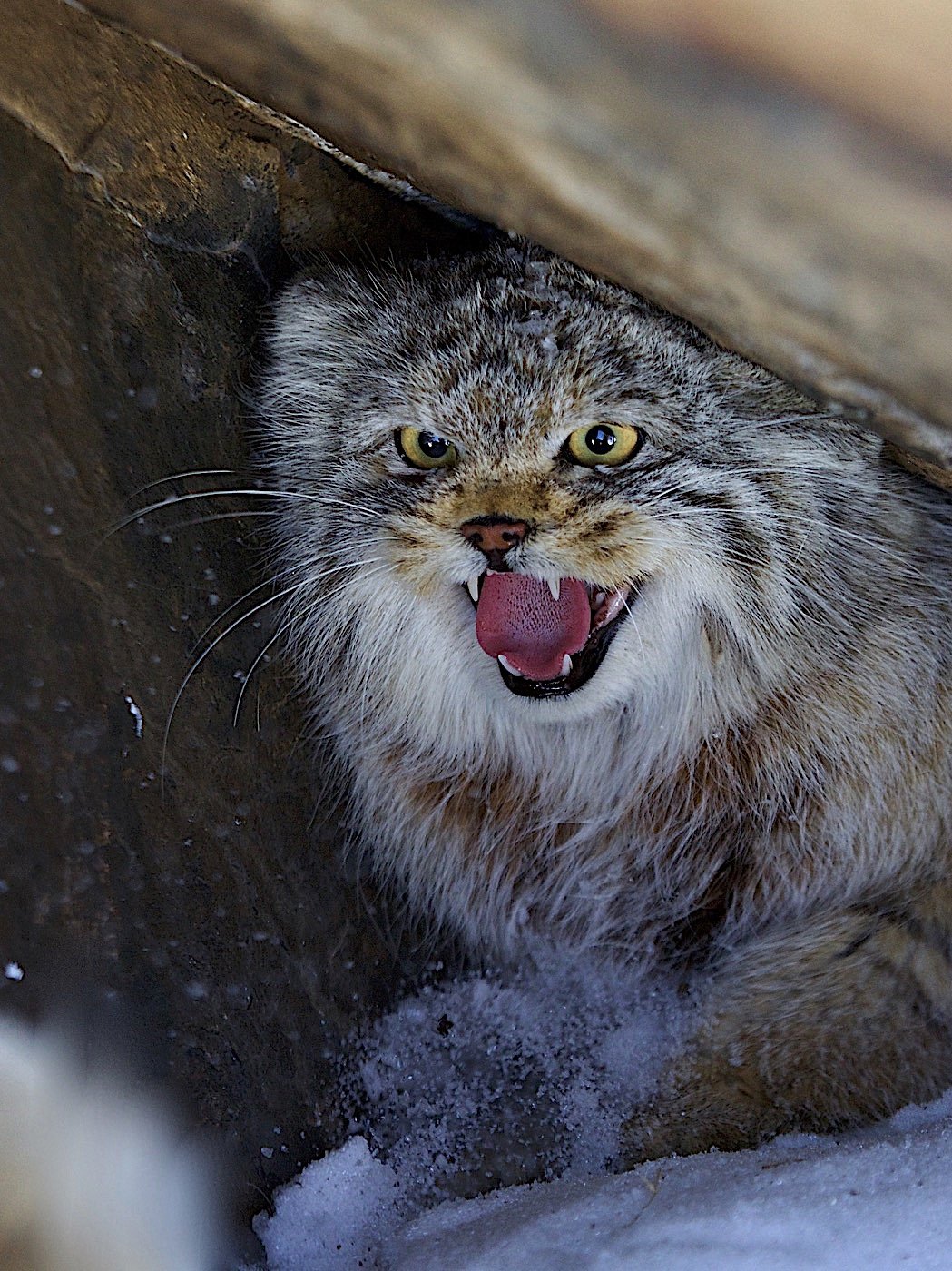 Основная трудность при съёмке дикого "краснокнижного" кота - увидеть его... Манул крайне осторожен, медленно перемещается ,при малейшем сомнении залезает в сурочью нору или под камень.Если рядом нет чего-то подходящего ,то прижимается к Земле-матушке и замирает. Словом старается избегать конфликтных ситуаций. Но если придётся встретить врага... Не извольте сомневаться, в гневе манул страшен!