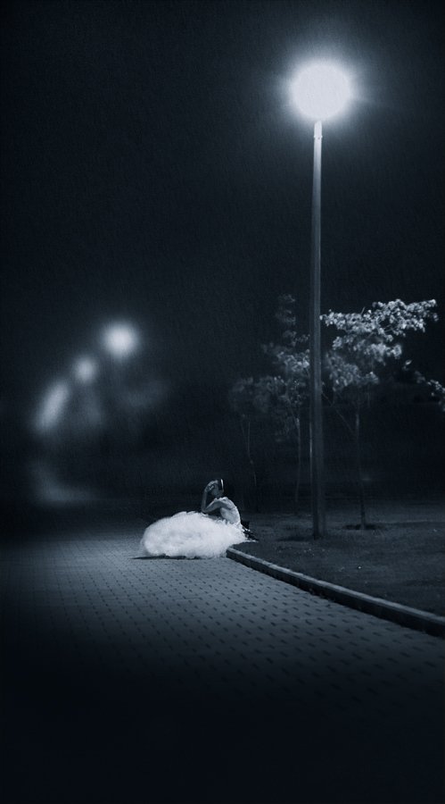 Тогда бы парапет и мостовая уже задавали бы направление. Плюс пятно света замечательно ставило бы акцент. И т.д. ... Получилось бы просто и вкусно:)