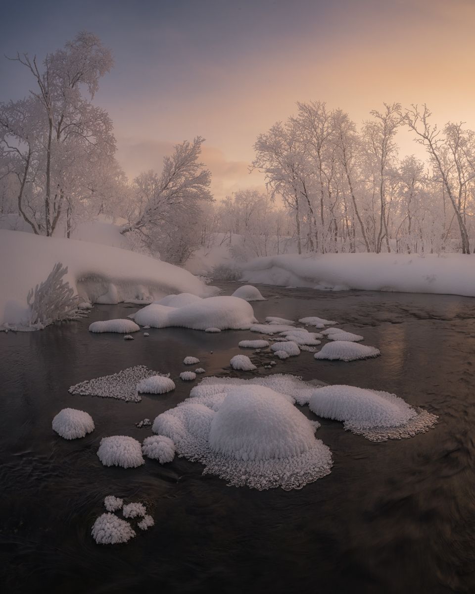 На краю ледяной реки — следы, будто оставленные невидимым медведем. Снег укрывает берега, деревья стоят в молчании, а вода, лишь слегка шевелясь, отражает небо, окрашенное в розовые и серые оттенки утра. Это не просто пейзаж — это мгновение, когда природа дышит медленно, и каждый след — история, не сказанная, но ощущаемая.