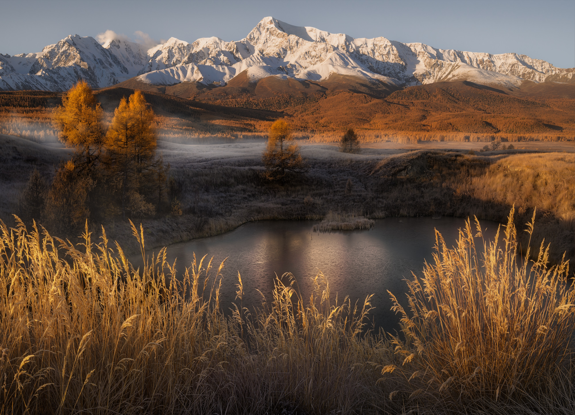 В тихом утреннем свете осень раскрывается во всей своей величественной красоте. Золотистые стебли тростника колышутся на ветру, отражаясь в спокойной глади озера, а вдали — величественные снежные вершины, словно охраняющие эту сказочную долину. Фотография передаёт гармонию природы, где каждый элемент — от травы до гор — вписан в единую картину. Это не просто пейзаж, а мгновение, застывшее в вечности.