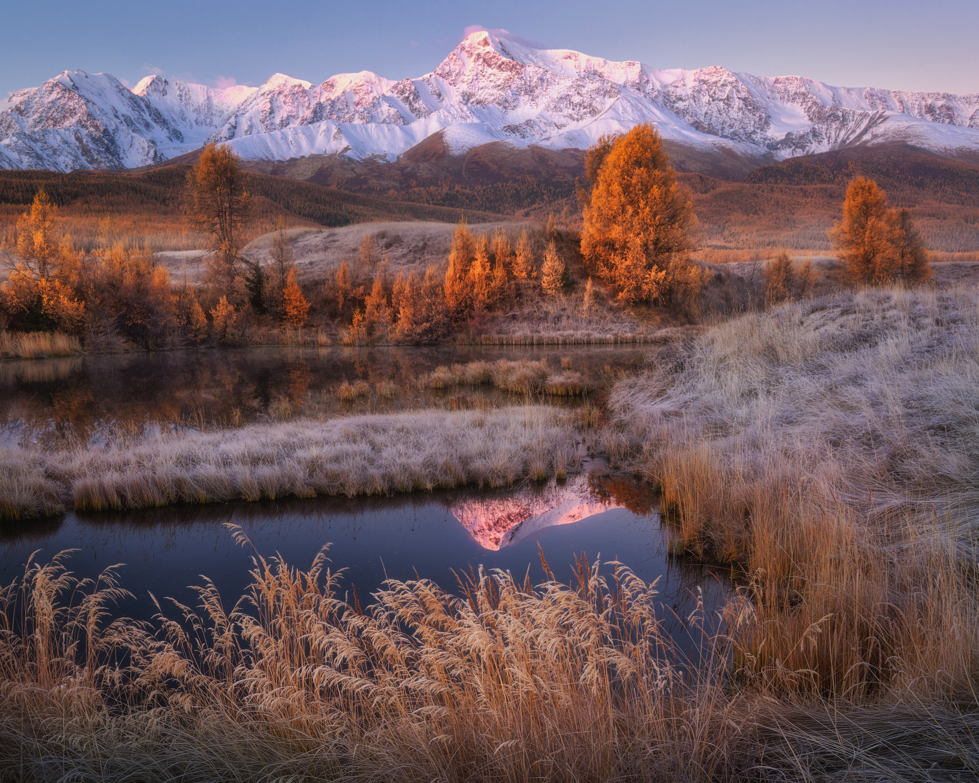 Мягкий свет рассвета озаряет осенний пейзаж, где золотистые деревья и белесые заросли отражаются в спокойной воде. На заднем плане — величественные снежные пики, окутанные прохладной дымкой. Сцена передаёт гармонию и умиротворение раннего утра в высокогорье.