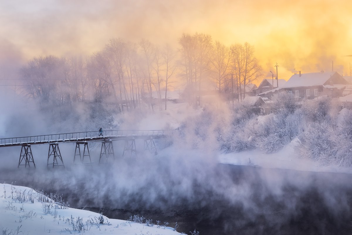 Незамерзающее в этом месте русло реки Белая Холуница, низкая температура и положение солнца делают этот пешеходный мост довольно загадочным в первые минуты рассвета.