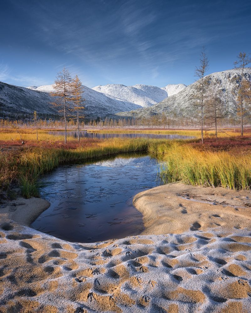 Утренние заморозки на озере Джека Лондона привели к появлению ледяной корки на песчаной косе, по которым прошли ноги "неизвестной" водоплавающей птицы.