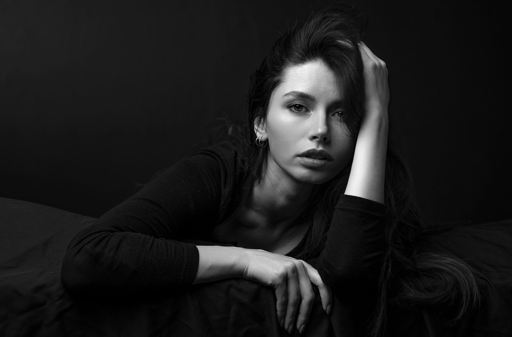 Фотограф Евгений Козлов создает выразительный черно-белый портрет женщины, передающий глубину внутреннего состояния. Модель в простой темной одежде находится в расслабленной, но напряженной позе — рука поддерживает голову, взгляд направлен прямо на зрителя. Темный фон усиливает контраст и фокусирует внимание на лице и жесте. Съемка выполнена в жанре художественного портрета с использованием студийного освещения для создания драматичной атмосферы. Композиция подчеркивает естественность момента и эмоциональную искренность.