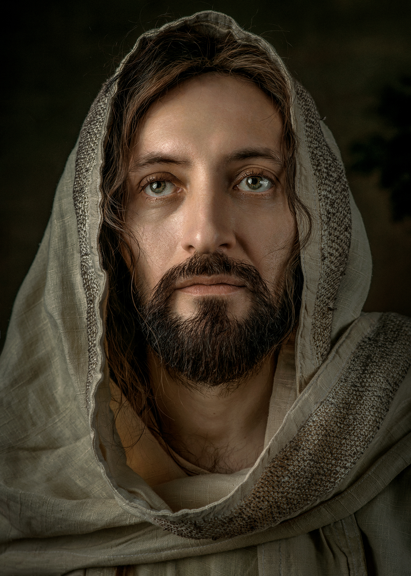 Свет в кадре мягко моделирует черты лица, акцентируя внимание на взгляде и текстуре ткани. Композиция сосредоточена, близкий план усиливает впечатление присутствия.