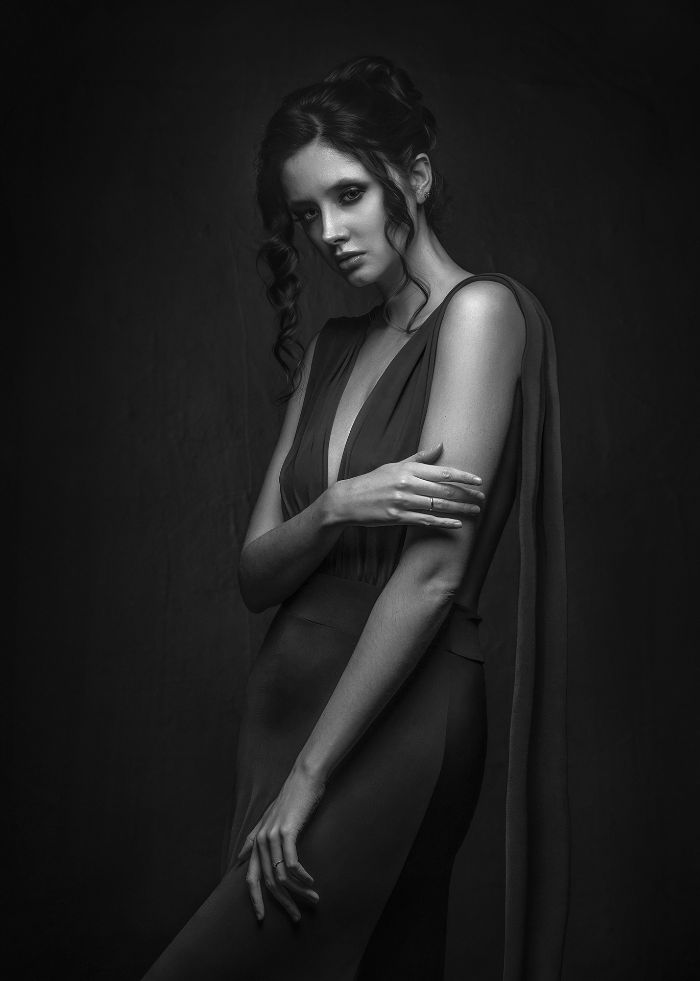 Получилось неплохо, Евгений. Снимок выдержан в строгой, почти классической манере — чёрно-белый, с глубоким контрастом и акцентом на линиях тела и текстуре ткани. Модель смотрит прямо, но с отстранённостью, что добавляет образу загадочности. Освещение подчёркивает изгибы фигуры, а поза — естественная, без лишней драматичности.