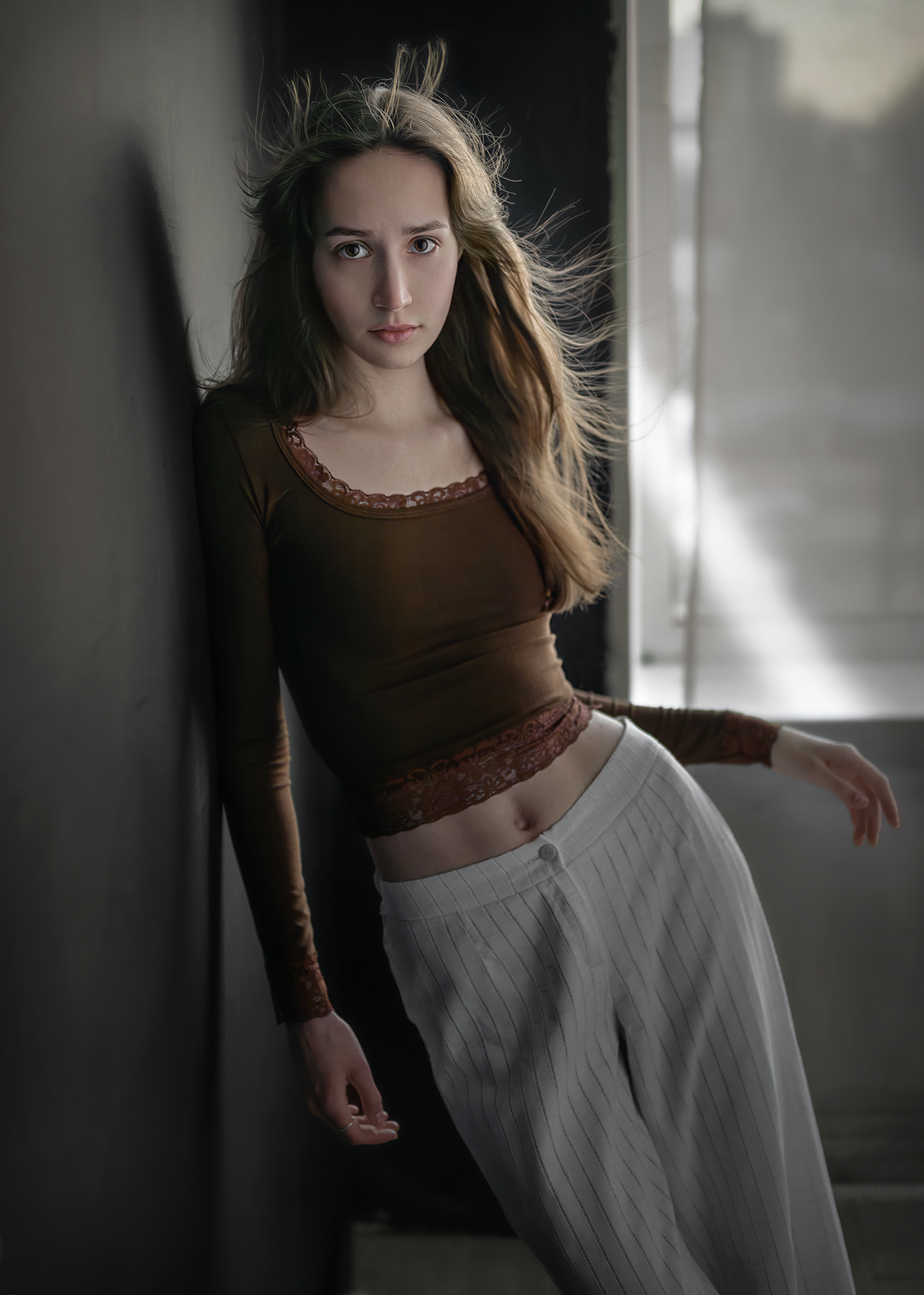 Евгений, снимок сдержан и атмосферный — свет играет на контрасте, выделяя линию тела и текстуру одежды. Взгляд модели прямой, почти задумчивый, создаёт ощущение внутреннего напряжения. Хорошо передана тишина пространства.