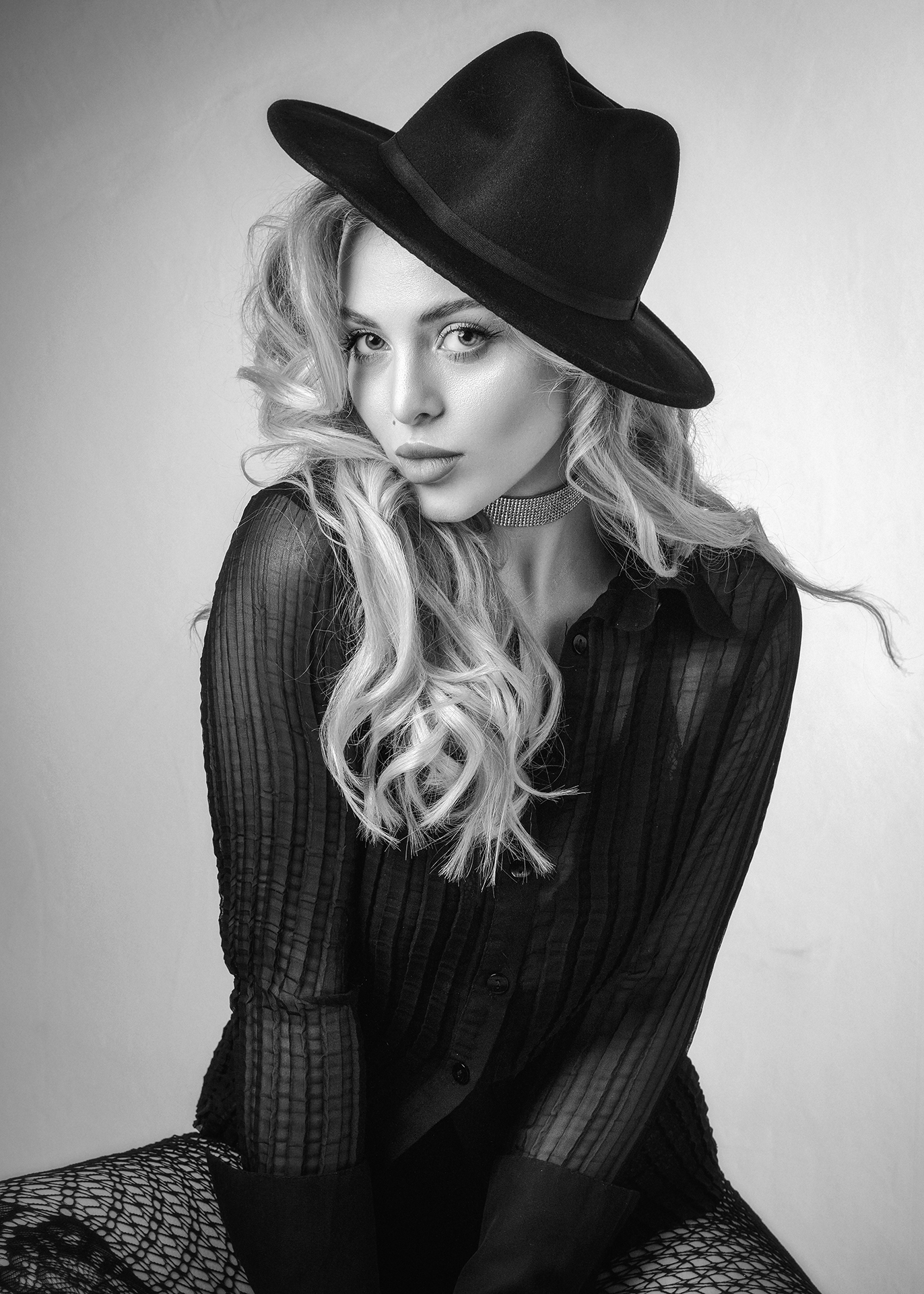 Черно-белый студийный портрет молодой женщины с длинными волнистыми волосами. Модель одета в темную рубашку с текстурным узором, широкополую шляпу и сетчатые перчатки, создавая образ, сочетающий классическую элегантность с современным бунтарским духом. Взгляд направлен прямо в камеру, выражая уверенность и характер. Работа выполнена фотографом Козловым Евгением.