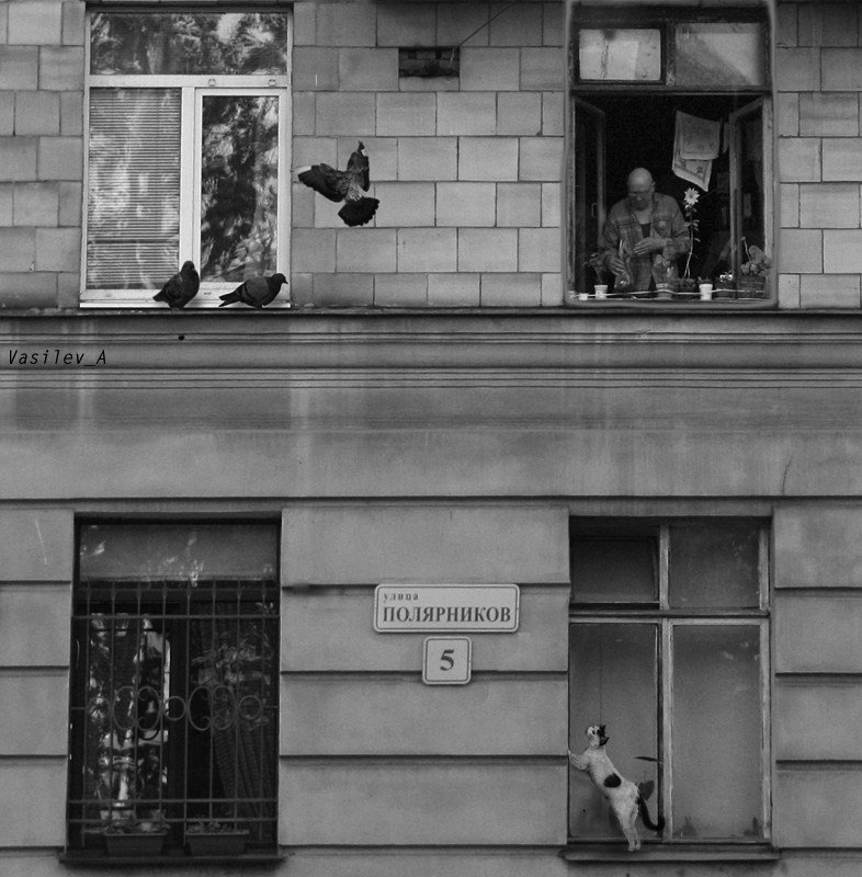 лысый, мужчина, голуби, кошка, лейка, окна, 5, Васильев Андрей