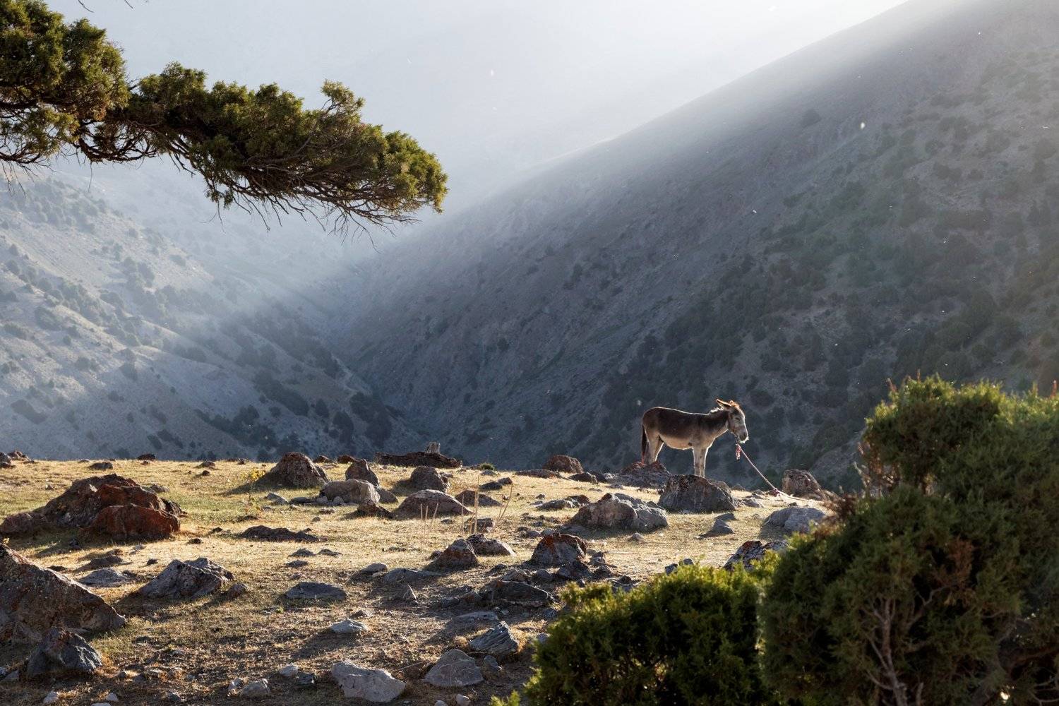 Ослик греется в первых лучах солнца Фанские горы, Таджикистан