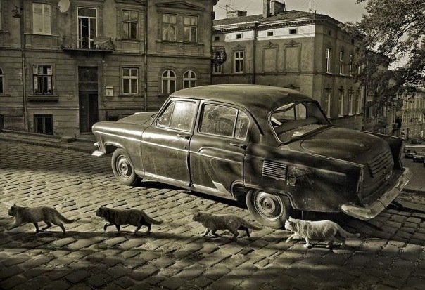 Вообще, классно: старый город, старая "Волга" и бегущие строем коты...