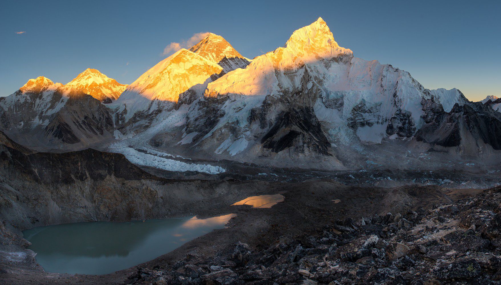 Закат с видом на гору Эверест(слева) и Нуптцзе (справа), панорама снята с горы Кала-Паттар 5643 метра, это самая высокая точка маршрута трека EBC.