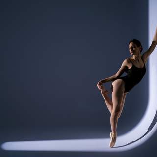 Strong use of negative space and sharp contrast defines the frame. The curved surface adds depth without clutter, and the dancers’ lines are clean, almost architectural. The mirrored pose—almost symmetrical, yet not—creates visual tension that holds attention.