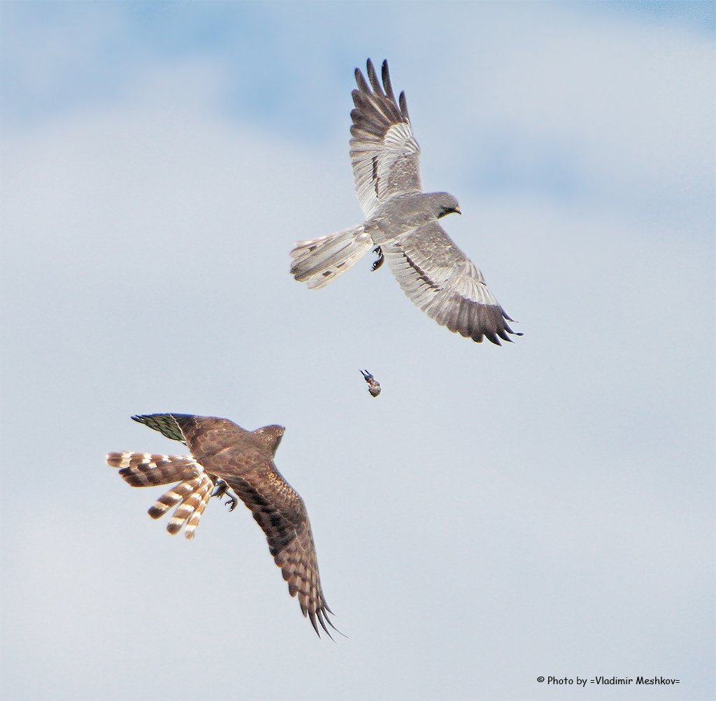 Луговой лунь (самец) передаёт в полёте полёвку самке.