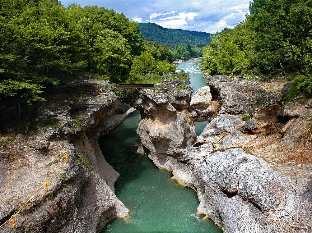 Хаджохская теснина реки Белой находится на юго-западной окраине поселка Каменномостский респ. Адыгея. Длина теснины составляет 350 — 400 м.Извилистая щель имеет ширину 6 — 7 м, местами всего 2 м, а глубину до уровня воды — 35 м.Вырвавшись из теснины, река замедляет свой бег, расширяясь до 50 — 60 м.
