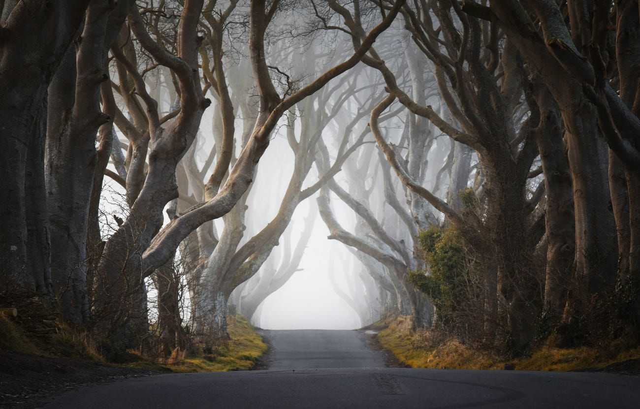 Дорога, проложенная сквозь густой лес, исчезает в белесом тумане, словно поглощаемая неизвестностью. Изогнутые стволы деревьев, словно живые существа, нависают над проезжей частью, создавая арку, напоминающую врата в иной мир. Это место — не просто пейзаж, а сцена из древней легенды, где каждый шаг может привести к встрече с духами или потеряться в вечности. Фотография Carsten Meyerdierks передает ощущение одновременного ужаса и заворожения, превращая обычную дорогу в путь к тайнам, скрытым за туманом.