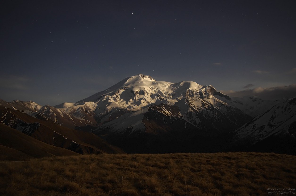 Эльбрус в лунном свете под звездами... Это было завораживающе! Надеюсь, фото передает, хоть частично, тот вид...