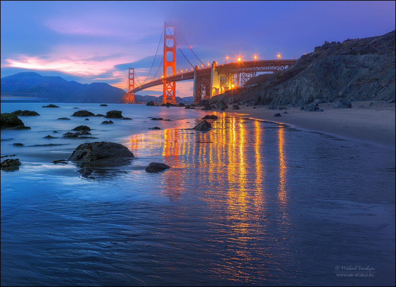 США, Сан-Франциско, Калифорния, мост, закат, отражения, город, Золотые ворота, Golden gate, , Михаил Воробььев
