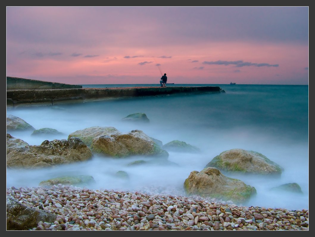 ...ну на самом деле все гораздо глубже:"ловец заката" находится по ту сторону кадра с фотоаппаратом (это я), а мужик на причале просто ловит рыбу...;-)