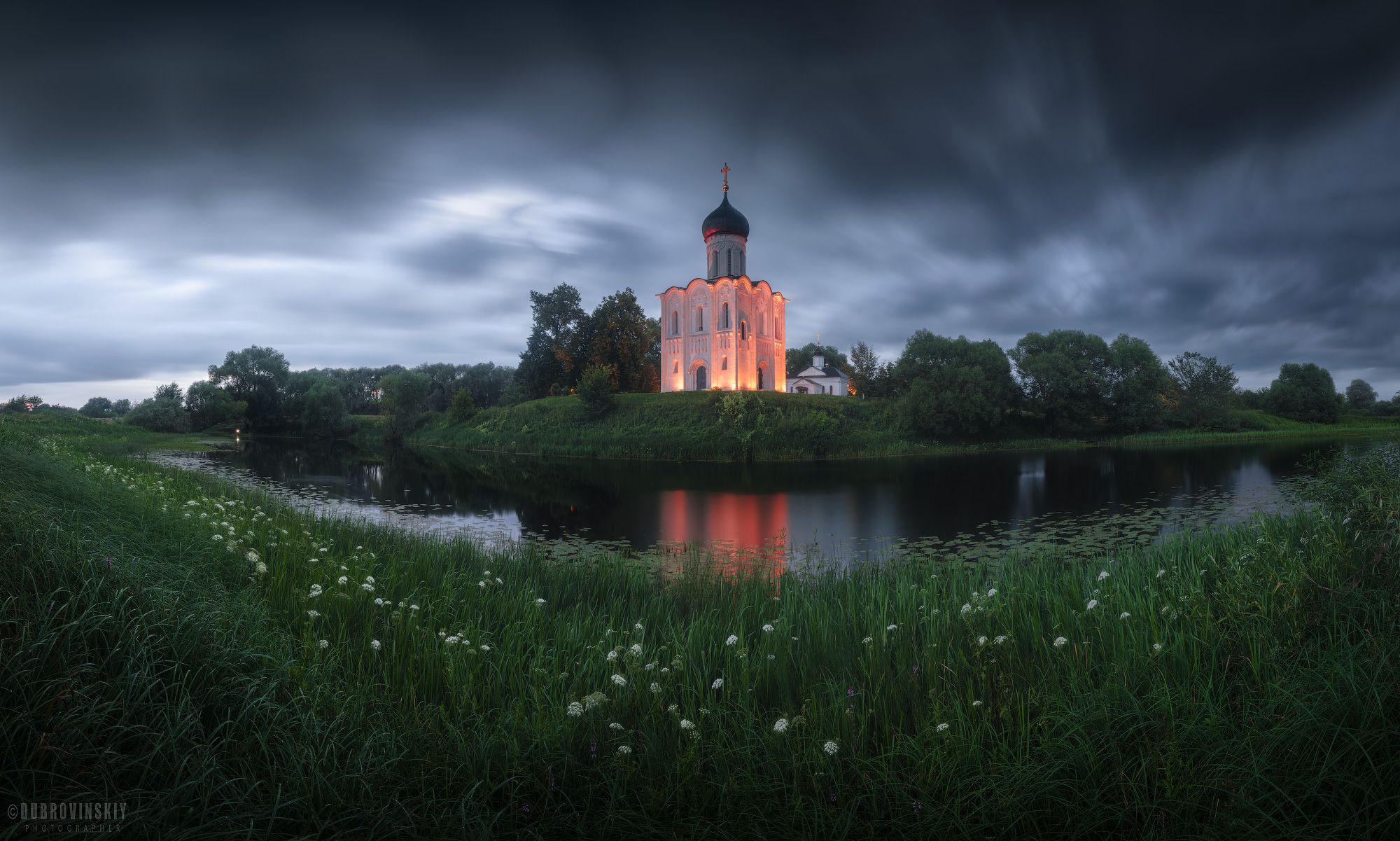 В сумерках над рекой Нерль возвышается церковь Покрова, озарённая тёплым светом, в то время как небо затянуто тяжёлыми тучами. Фотограф Михаил Дубровинский запечатлел этот мистический момент — где древность встречается с природой, а свет символизирует надежду. Отражение в воде умножает впечатление, создавая ощущение вечности. Это не просто пейзаж — это история, живая в каждом луче.