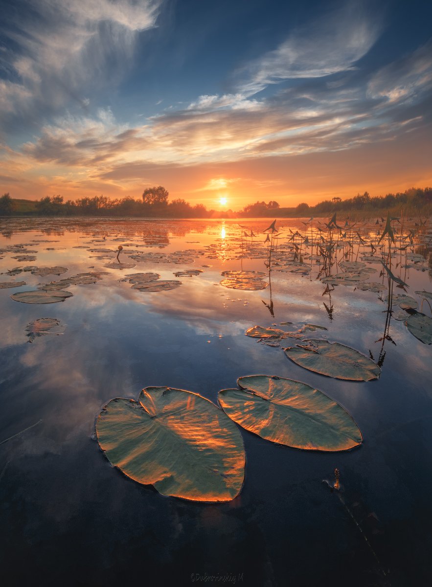 кувшинки, закат, тырница, река, лето, Михаил Дубровинский