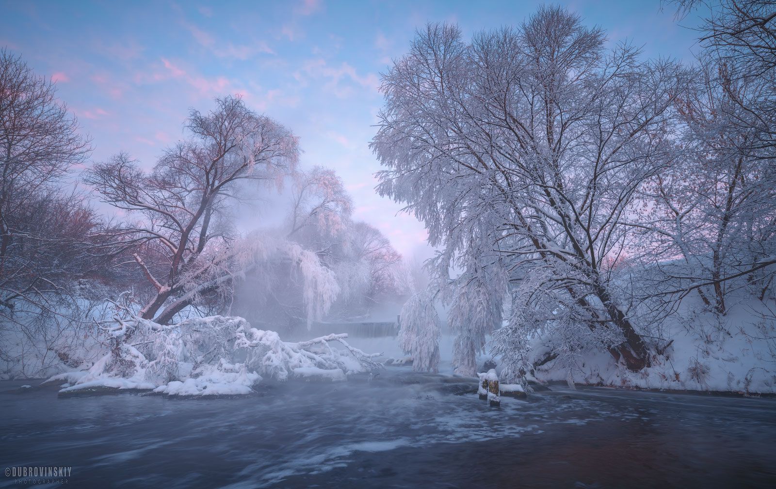 На берегах реки Листвянка в Рязанской области — тишина и чистота зимнего утра. Деревья покрыты инеем, вода замерзает, а небо окрашено в нежные оттенки рассвета. Фотограф Михаил Дубровинский запечатлел морозную красоту природы, где каждая ветка — как кристалл.