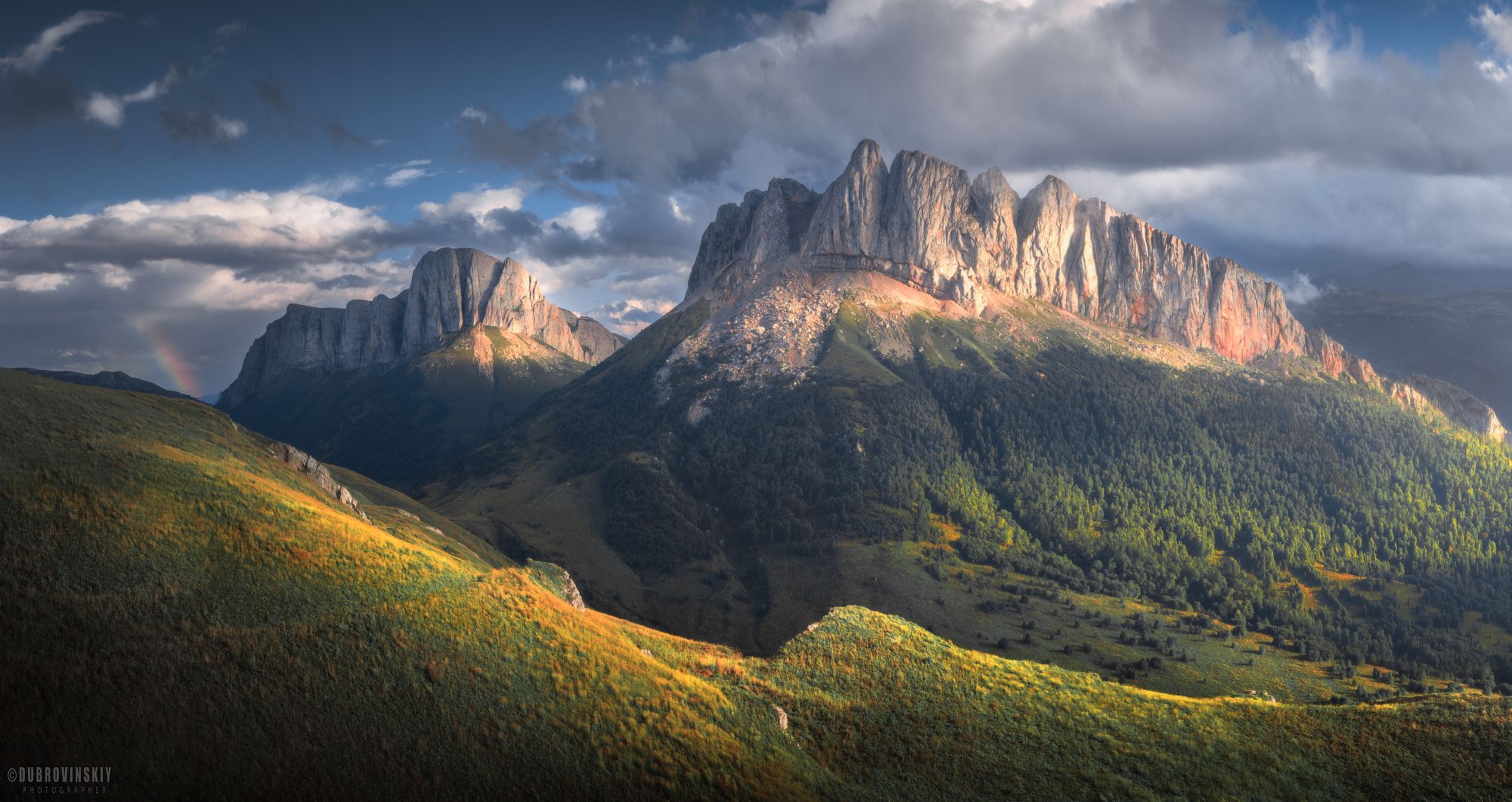 В сердце Адыгеи, на фоне драматического неба, возвышается Ачешбоки — одна из самых впечатляющих горных вершин Кавказа. Летний свет мягко ложится на зелёные склоны, подчёркивая мощь скал и глубину ущелья. Облака, будто замершие в полёте, добавляют сцене мистицизма. Это не просто пейзаж — это живое дыхание природы, где каждый луч света рассказывает о вечности. Фотограф Дубровинский Михаил запечатлел момент, когда земля и небо сливаются в едином порыве.