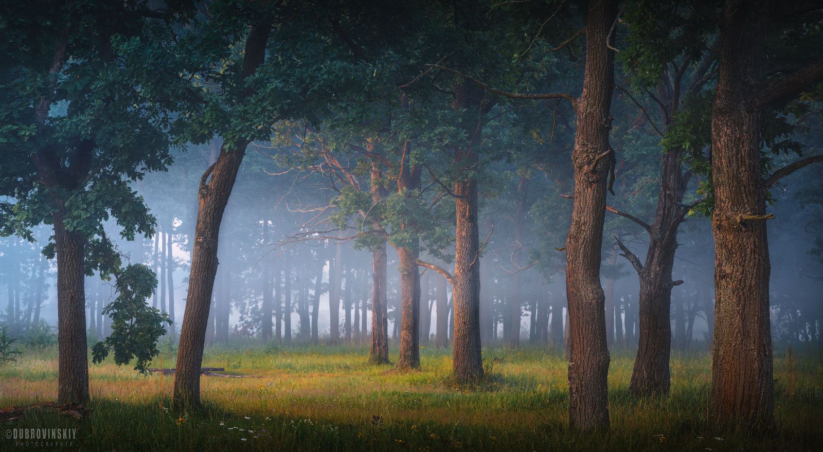 В тишине раннего летнего утра туман медленно стелется по земле, окутывая дубовую рощу тонкой пеленой. Свет проникает сквозь густые кроны, рисуя на траве золотистые блики. Каждое дерево — как страж древнего леса, возвышающийся в молчаливом величии. Воздух напоён свежестью и ароматом хвои, а тишина будто замерла, ожидая пробуждения. Это место — где время останавливается, а душа находит покой. Фотография Михаила Дубровинского передаёт не просто пейзаж, а ощущение — волшебства, что живёт в сердце леса.