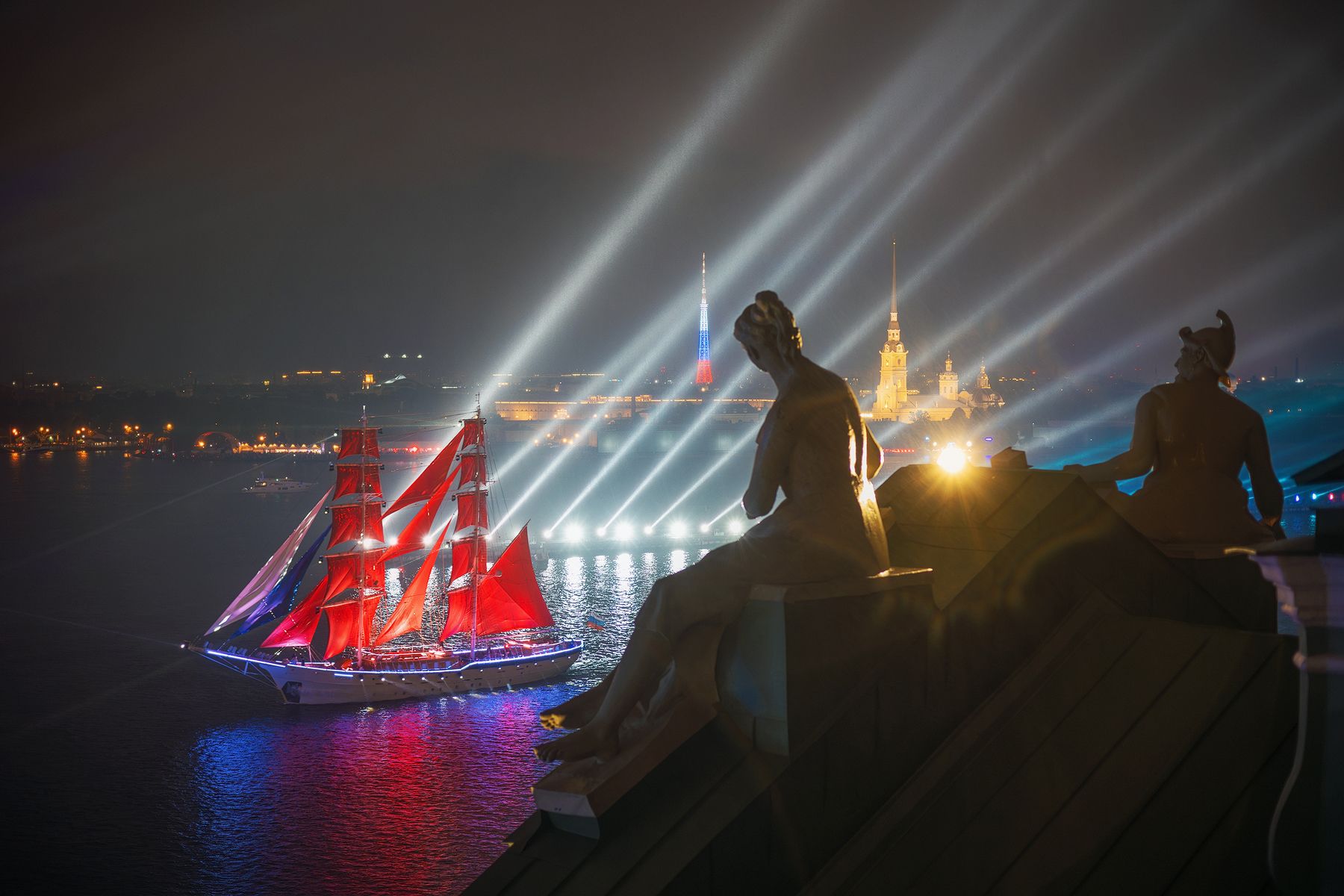 На фоне городского силуэта с яркими световыми лучами в ночном небе — красный парусник, отражающийся в воде. В переднем плане — скульптуры, создающие ощущение наблюдения за происходящим. Сцена сочетает динамику морского судна и статичность архитектурных форм. Фотография передает атмосферу современного городского пейзажа, где искусство, техника и природа сливаются в едином ночном кадре. Работа Михаила Проскалова.
